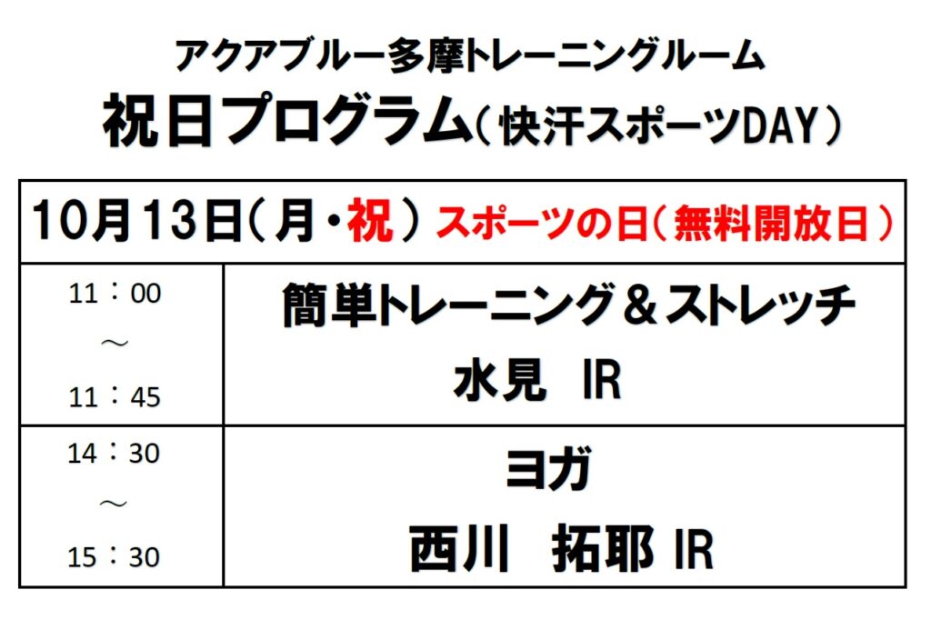 トレーニング2025年10月3日 令和7年10月13日(月・祝)祝日プログラムのお知らせ 日頃からアクアブルー多摩をご利用いただきありがとうございます。令和7年10月13日(月・祝)は祝日の為、ミニスポーツホール教室内容が通常とは異なります。また、当日は無料開放日となります。下記内容に変更になりますので、ご注意ください。 会場・お問合せ:アクアブルー多摩 東京都多摩市南野3-15-2 042(338)7667