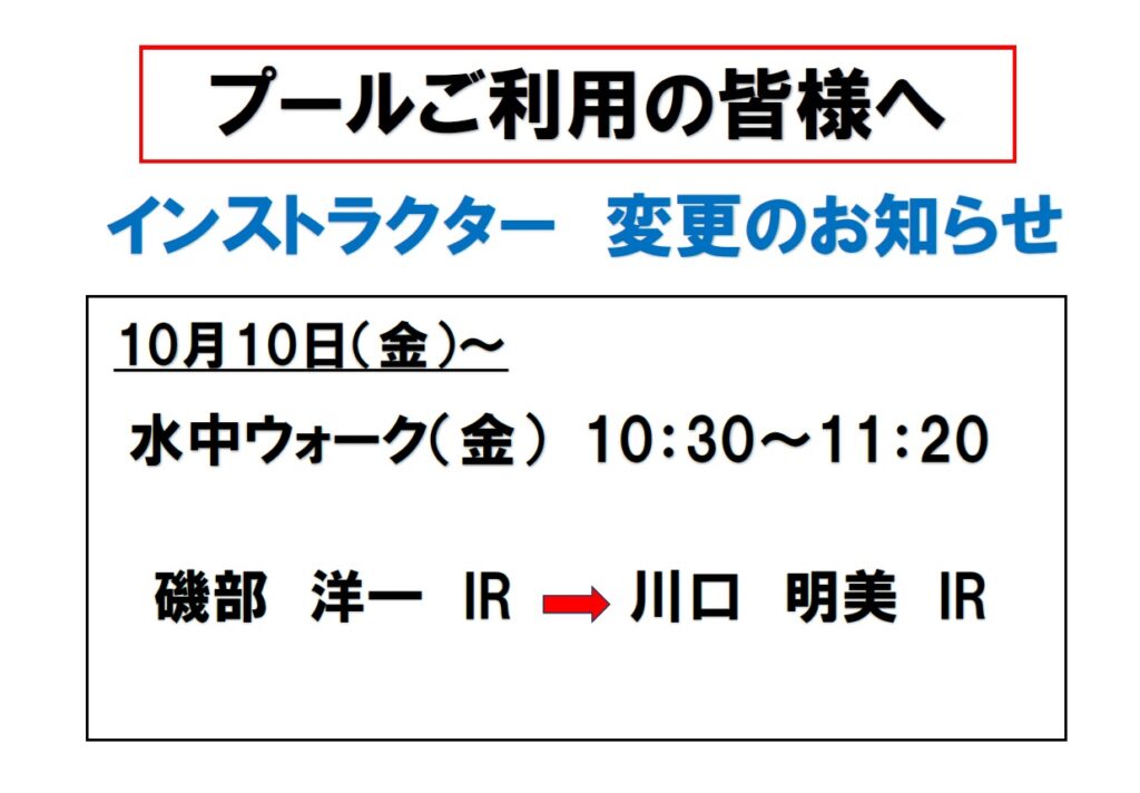 プール2025年10月7日 【緊急】金曜10時30分開始「水中ウォーク」担当者変更のお知らせ(10月10日~) 日頃からアクアブルー多摩をご利用いただきありがとうございます。 毎週金曜10時30分開始「水中ウォーク」教室につきまして、 令和7年10月10日(金)より担当インストラクターは下記へ変更となります。 急な変更となりご利用のお客様にはご迷惑をお掛け致しますが、ご理解ご協力をお願いいたします。 会場・お問合せ:アクアブルー多摩 東京都多摩市南野3-15-2 042(338)7667