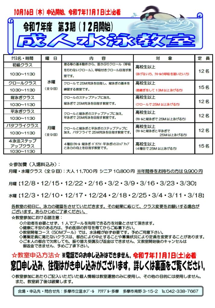 大変お待たせ致しました、12月から開始いたします、成人向け水泳教室募集の