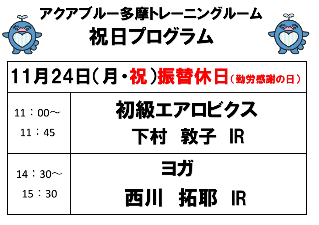 トレーニング2025年10月21日 令和7年11月24日(月・祝)祝日プログラムのお知らせ 日頃からアクアブルー多摩をご利用いただきありがとうございます。令和7年11月24日(月・祝)は祝日の為、ミニスポーツホール教室内容が通常とは異なります。下記内容に変更になりますので、ご注意ください。 会場・お問合せ:アクアブルー多摩 東京都多摩市南野3-15-2 042(338)7667