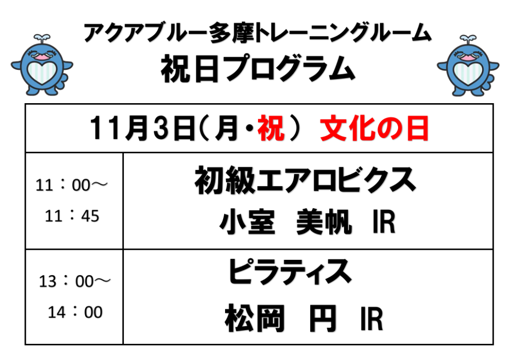 トレーニング2025年10月21日 令和7年11月3日(月・祝)祝日プログラムのお知らせ 日頃からアクアブルー多摩をご利用いただきありがとうございます。令和7年11月3日(月・祝)は祝日の為、ミニスポーツホール教室内容が通常とは異なります。下記内容に変更になりますので、ご注意ください。 会場・お問合せ:アクアブルー多摩 東京都多摩市南野3-15-2 042(338)7667