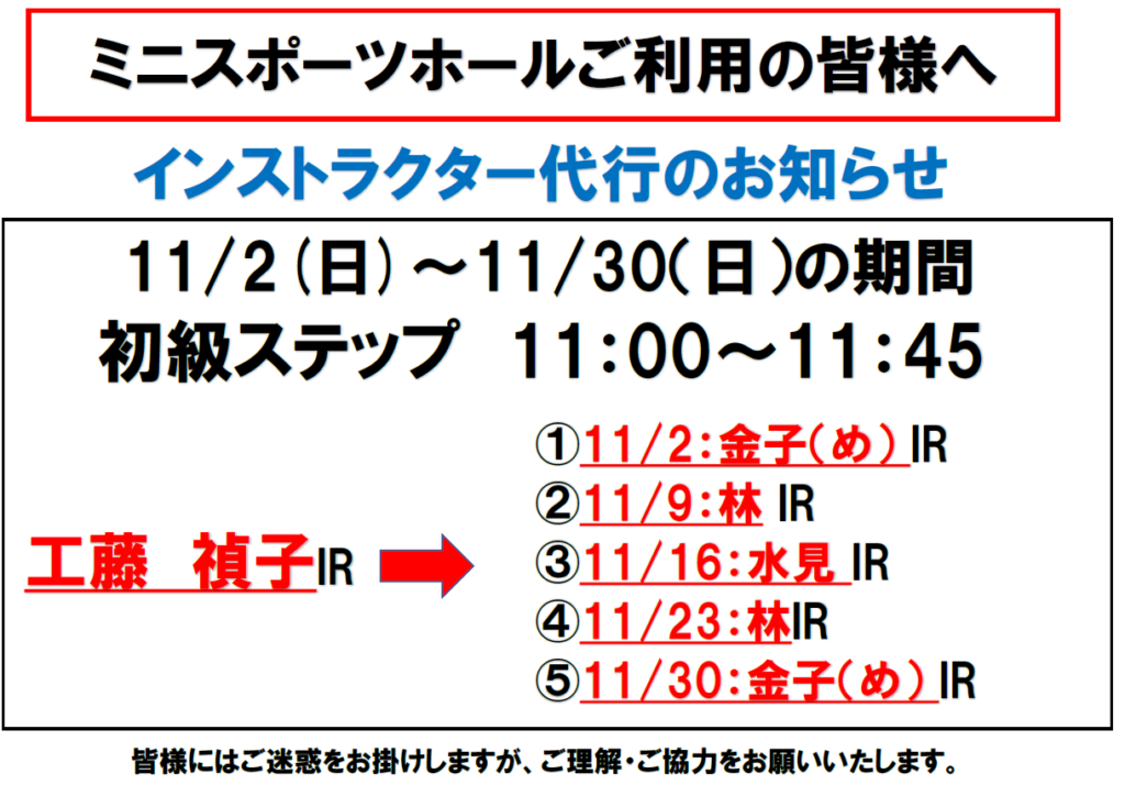 トレーニング2025年10月29日 【緊急】令和7年11月 日曜日11時開始「初級ステップ」教室担当者変更のお知らせ 日頃からアクアブルー多摩をご利用いただきありがとうございます。 毎週日曜日11時開始「初級ステップ」教室につきまして、 担当インストラクター都合により、11月の教室は下記インストラクターに変更となります。 急な変更となりご利用のお客様にはご迷惑をお掛け致しますが、ご理解ご協力をお願いいたします。