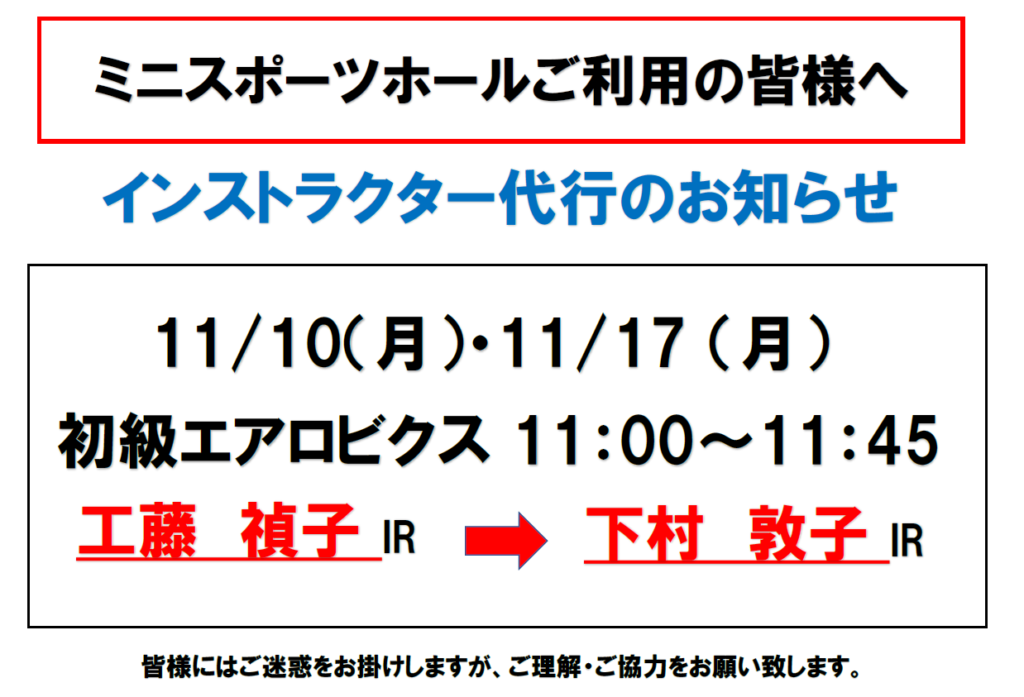 【緊急】令和7年11月10日、17日11時開始「初級エアロビクス」教室内容及び担当者変更のお知らせ