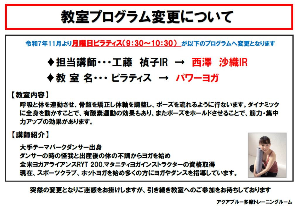 トレーニング2025年11月8日 【緊急】令和7年11月 月曜日9時30分開始「ピラティス」教室担当者変更のお知らせ 日頃からアクアブルー多摩をご利用いただきありがとうございます。 毎週月曜日9時30分開始「ピラティス」教室につきまして、 担当インストラクターの都合により、11月から下記教室及びインストラクターに変更となります。 急な変更となりご利用のお客様にはご迷惑をお掛け致しますが、ご理解ご協力をお願いいたします。