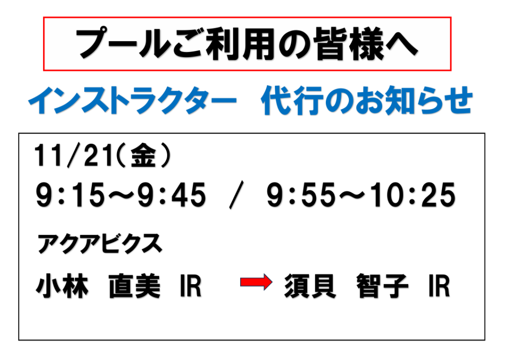 プール2025年11月19日 11月21日(金)9:15開始 / 9:55開始「アクアビクス」インストラクター代行のお知らせ 日頃からアクアブルー多摩をご利用いただきありがとうございます。 11/21(金)9時15分開始/9:55開始「アクアビクス」教室につきまして、 担当インストラクターの都合により、下記インストラクターに変更となります。 急な変更となりご利用のお客様にはご迷惑をお掛け致しますが、ご理解ご協力をお願いいたします。