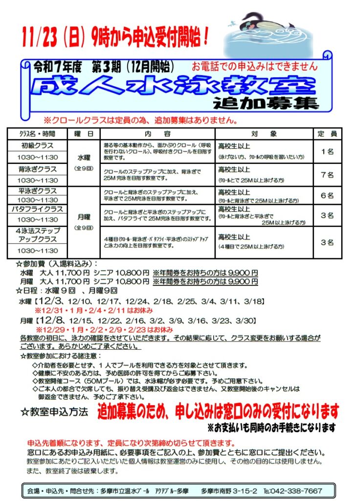 先着順で、アクアブルー多摩3階プール事務室にて追加募集の申込開始いたします、