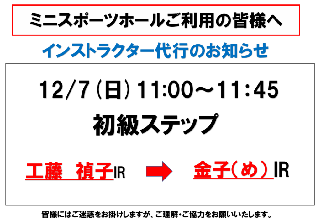 トレーニング2025年12月6日 【緊急】12月7日 日曜日11時開始「初級ステップ」教室担当者変更のお知らせ 日頃からアクアブルー多摩をご利用いただきありがとうございます。 12/7(日)11時開始「初級ステップ」教室につきまして、 担当インストラクター都合により、下記インストラクターに変更となります。 急な変更となりご利用のお客様にはご迷惑をお掛け致しますが、ご理解ご協力をお願いいたします。