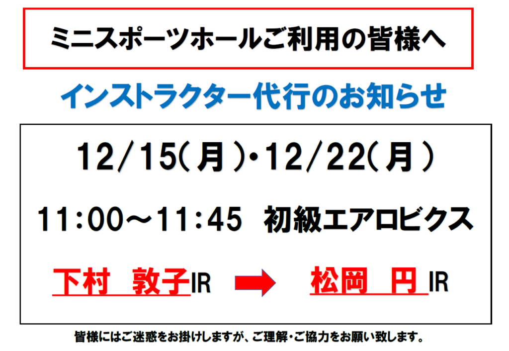 トレーニング2025年12月10日 【緊急】令和7年12月15日・22日 月曜日11時00分開始「初級エアロビクス」教室担当者変更のお知らせ 日頃からアクアブルー多摩をご利用いただきありがとうございます。 2025年12月15日と22日 月曜日11時00分開始「初級エアロビクス」教室につきまして、 担当インストラクターの都合により、下記インストラクターに変更となります。 急な変更となりご利用のお客様にはご迷惑をお掛け致しますが、ご理解ご協力をお願いいたします。