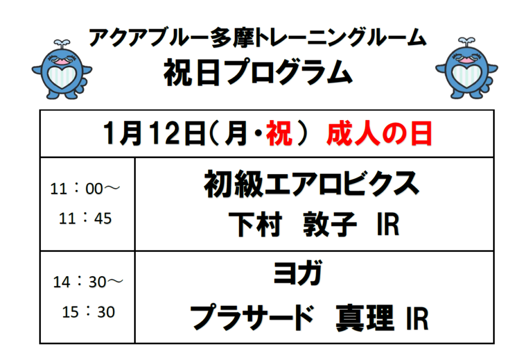 トレーニング2025年12月18日 令和8年1月12日(月・祝)祝日プログラムのお知らせ 日頃からアクアブルー多摩をご利用いただきありがとうございます。令和8年1月12日(月・祝)は祝日の為、ミニスポーツホール教室内容が通常とは異なります。下記内容に変更になりますので、ご注意ください。 会場・お問合せ:アクアブルー多摩 東京都多摩市南野3-15-2 042(338)7667
