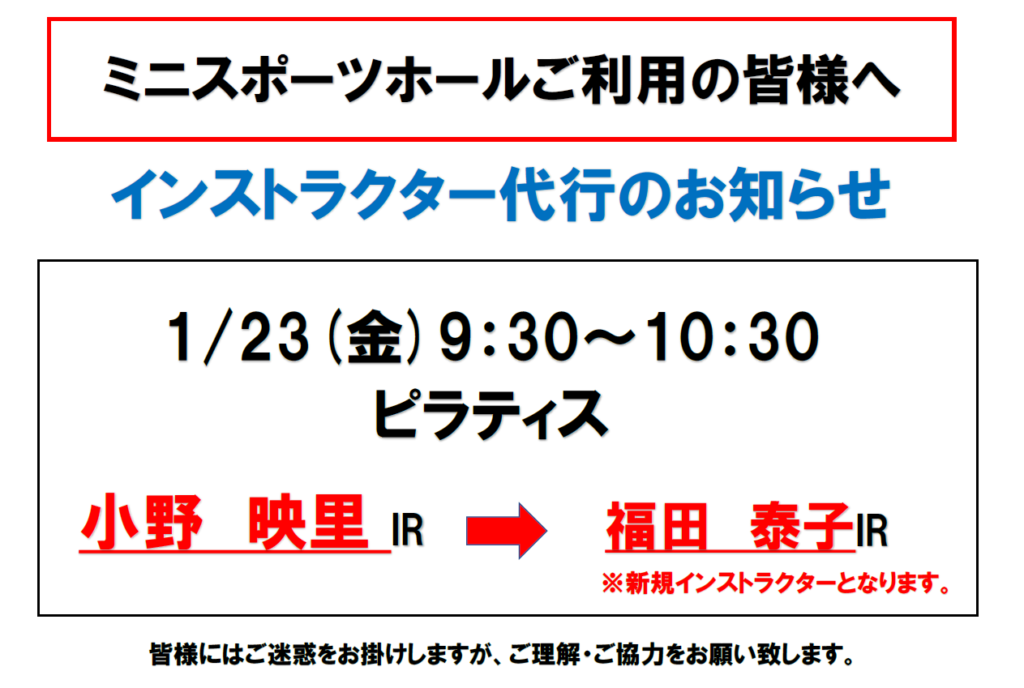 トレーニング2026年1月22日 【緊急】令和8年1月23日9時30分開始「ピラティス」担当者変更のお知らせ 日頃からアクアブルー多摩をご利用いただきありがとうございます。 令和8年1月23日(金)9時30分開始「ピラティス」教室につきまして、 担当インストラクター都合により、下記インストラクター及び教室内容に変更となります。 急な変更となりご利用のお客様にはご迷惑をお掛け致しますが、ご理解ご協力をお願いいたします。