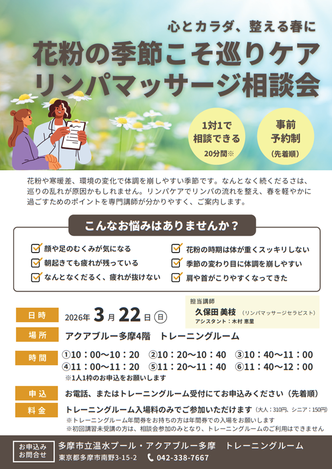 トレーニング2026年2月23日 令和8年3月スポーツ・健康相談会開催のご案内 日頃からアクアブルー多摩をご利用いただきありがとうございます。 アクアブルー多摩では、月に1回スポーツや健康についてテーマを決めての相談会を開催しております。 3月のテーマは、 「花粉の季節こそ巡りケアリンパマッサージ相談会」 になります。お上記についてお悩みの方は、是非ご利用ください。(要予約・申し込み先着順、料金はトレーニングルーム利用料のみ) 会場・お申し込み・お問合せ:アクアブルー多摩 042(338)7667