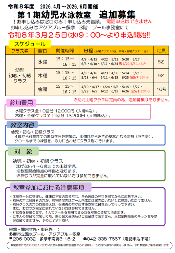 先着順で、アクアブルー多摩3階プール事務室にて追加募集の申込受付いたします、
