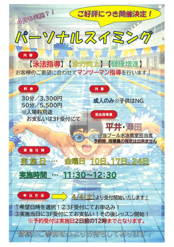 ご好評いただきました、「パーソナルスイミング」を4月も開催することが決定いたしました。