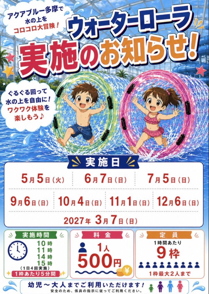 イベント2026年4月29日 令和8年度ウォーターローラー定期開催のお知らせ 日頃からアクアブルー多摩をご利用いただきありがとうございます。 毎度、ご好評いただいておりますウォーターローラーを令和8年5月5日(火・祝)より定期開催いたします。日程は下記をご確認ください。皆様のご来館お待ちしております。 会場・お問合せ:アクアブルー多摩 東京都多摩市南野3-15-2 電話042(338)7667
